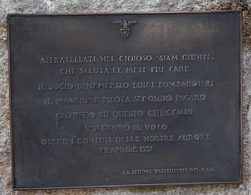Nell'ampio vallone di Scerscen, proprio sotto il rifugio Marinelli-Bombardieri, laddove sono i resti dell'elicottero, l'anno successivo al tragico incidente fu realizzato un piccolo ma significativo monumento e lì apposta una targa, a ricordo dei due scomparsi, che riporta la seguente citazione: